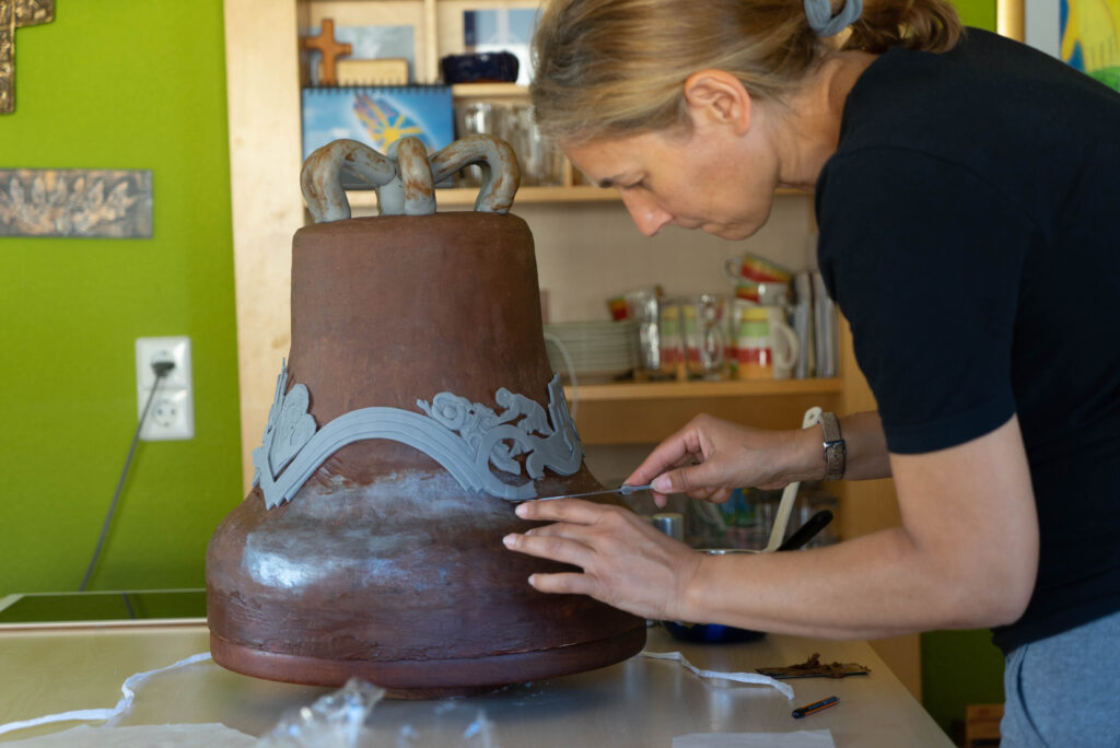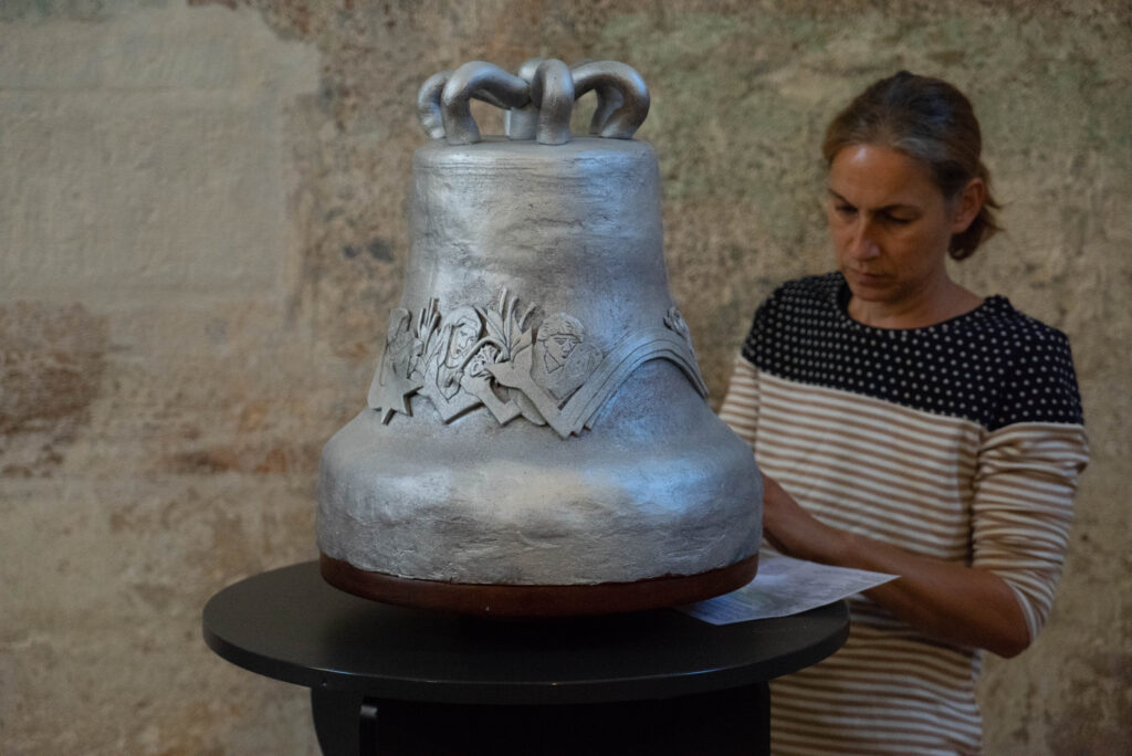 Besonderes Augenmerk galt der Glockenzier: Sie wurde aus Modellier- bzw. Zuckermasse (Fondant) gestaltet – nach der gleichen künstlerischen Vorlage, die auch die neue Bronzeglocke trägt. Für die echte Glocke hatte Helmut Lutz das Relief entworfen; in der Gießerei wurde es in Wachs von Hand modelliert, bevor es in die Glockenform eingelassen wurde. Für die Kuchenglocke wurden diese Motive sorgfältig ausgeschnitten, angepasst und auf den „Teigrohling“ übertragen.