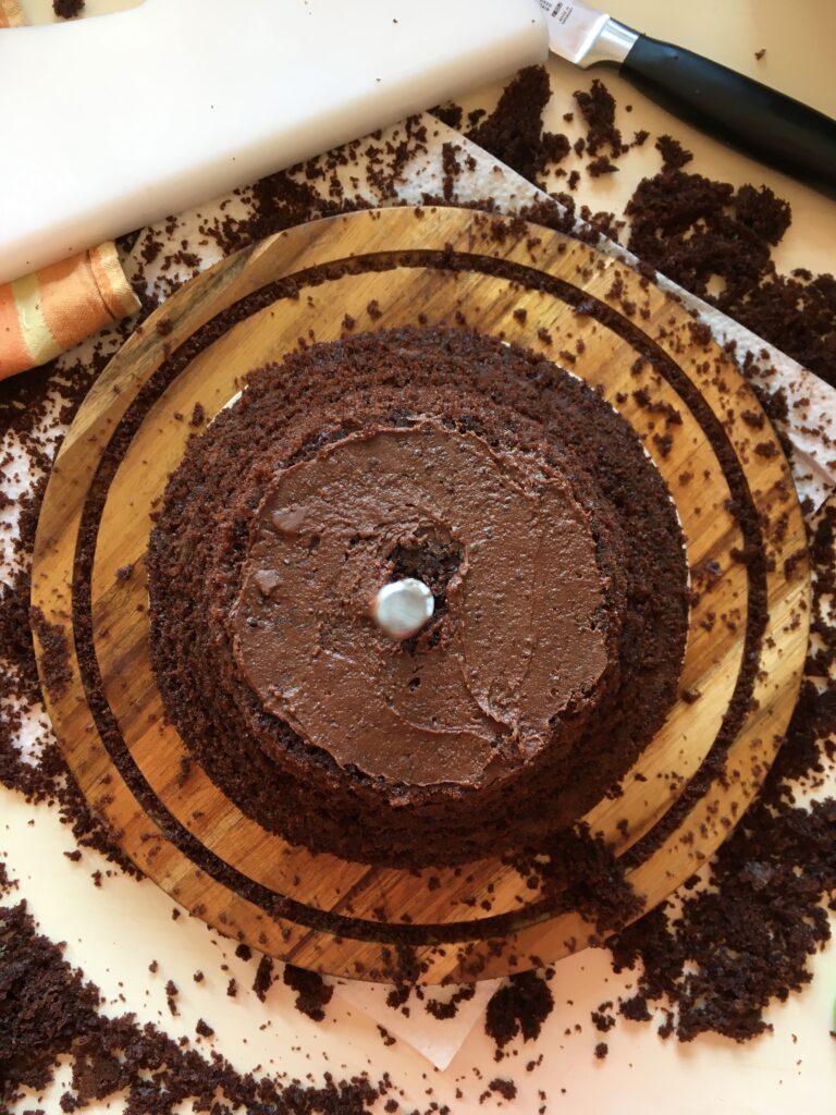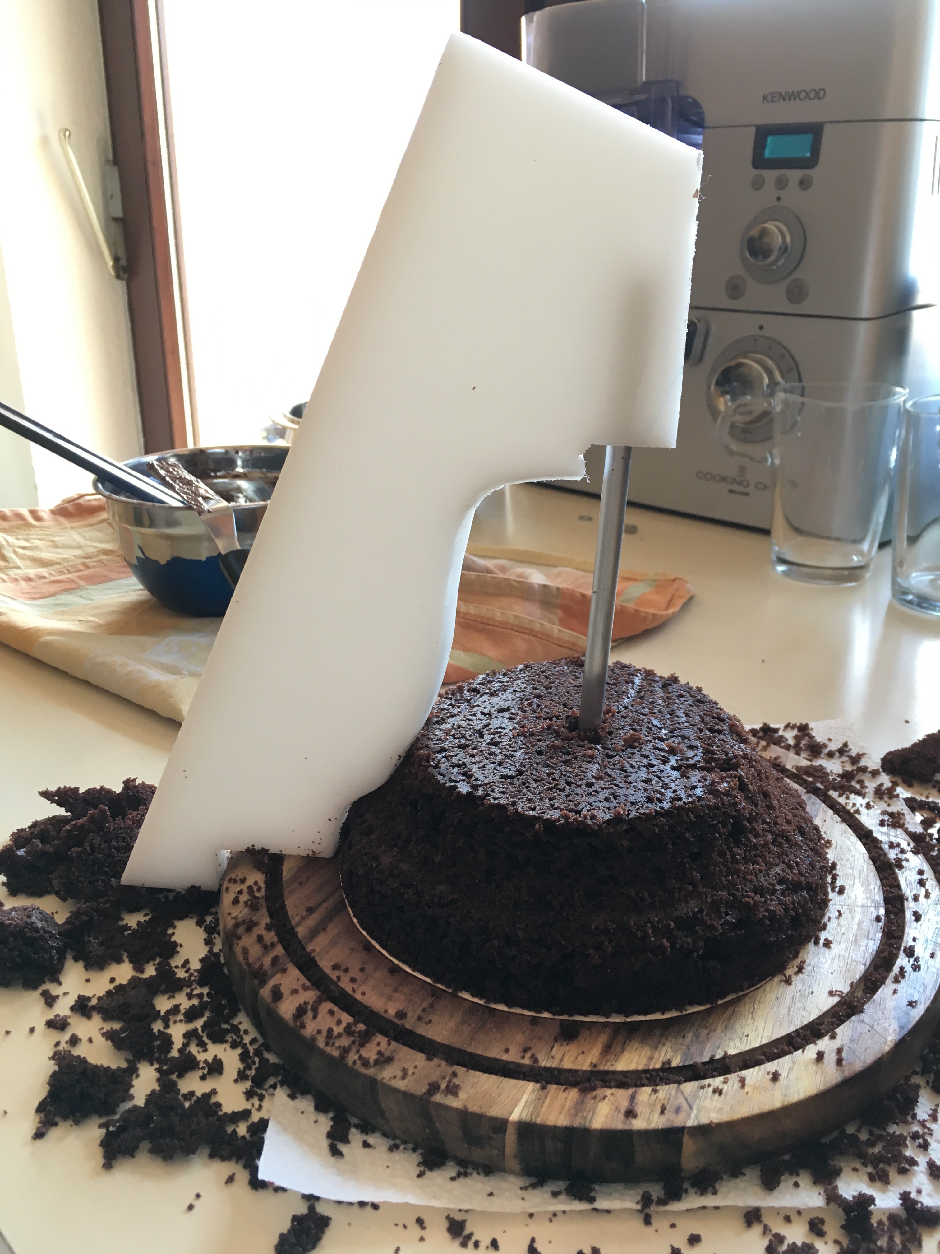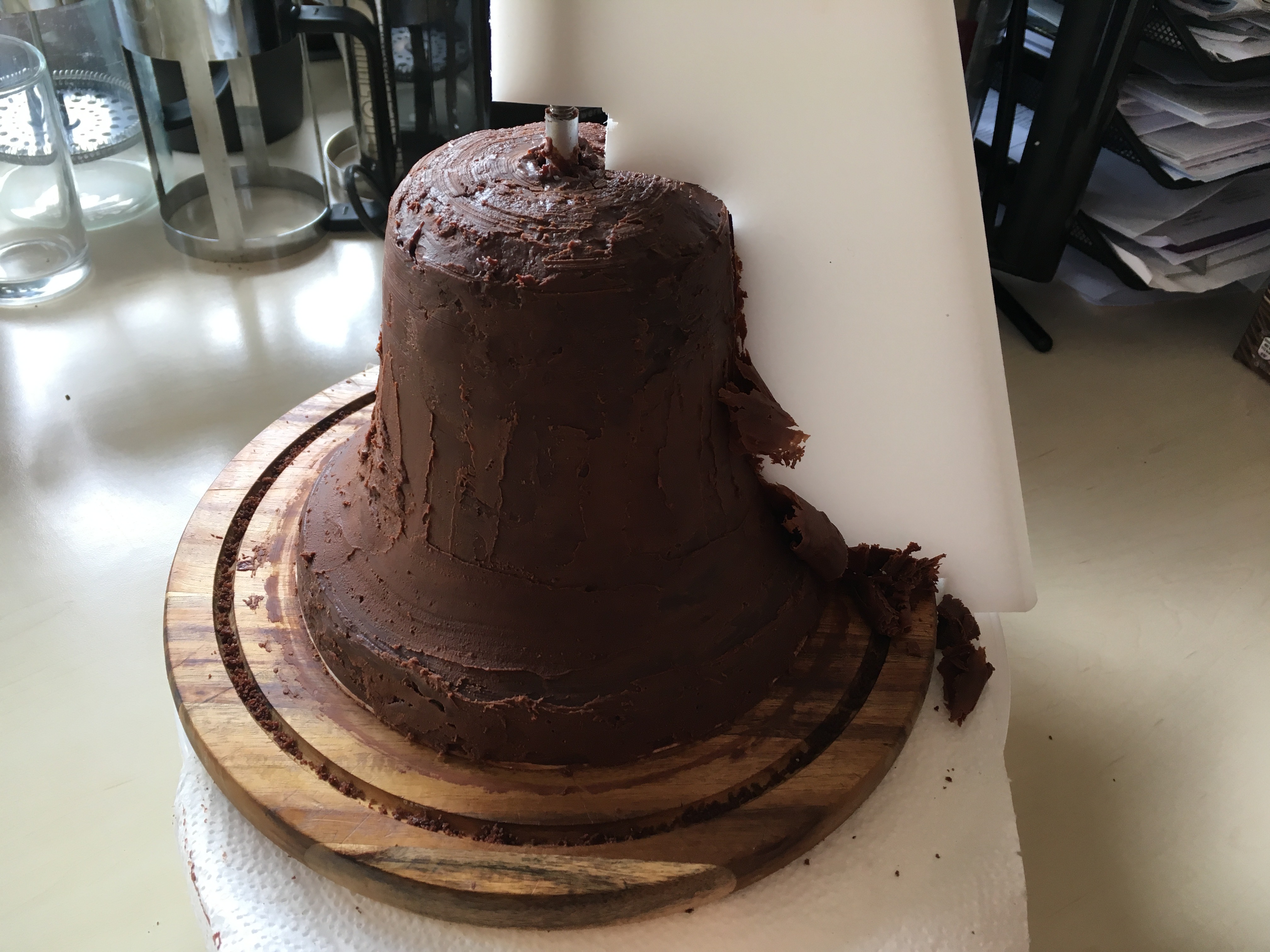 Aus elf übereinandergestapelten Kuchenböden wurde so Schritt für Schritt der Glockenkörper geformt. Jeder Boden wurde zurechtgeschnitten, mit einer Schokoladenganache gefüllt und außen glatt eingestrichen, bis die typische Glockensilhouette perfekt getroffen war. Am Ende stand eine beeindruckende Torte mit rund 41 cm Durchmesser, 45 cm Höhe und etwa 16 Kilogramm Gewicht.