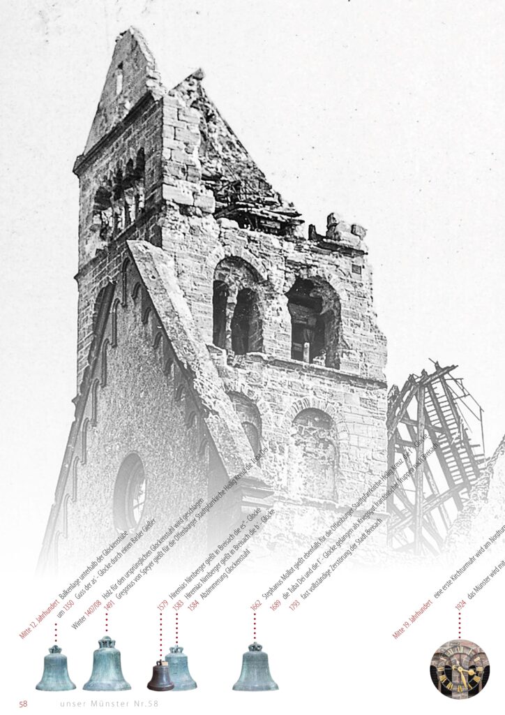 1689 wurden aus Offenburg insgesamt 22 Glocken als Beute abtransportiert – bestimmt für den Schmelzofen und die Umwandlung in Kanonen. Zwei der klanglich besonders geschätzten Glocken konnten jedoch in Breisach „freigekauft“ werden: Magistrat und Bürger waren so beeindruckt von ihrem Klang, dass sie den zuständigen Artillerieoffizier gegen Zahlung einer erheblichen Summe überredeten, andere, „mißtönige“ Glocken für die Kanonenproduktion herzugeben. Aus fast sicher zum Tode verurteilten Metallkörpern wurden so „alte Offenburgerinnen im Breisacher Münster“, die bis heute von dieser Rettung erzählen.